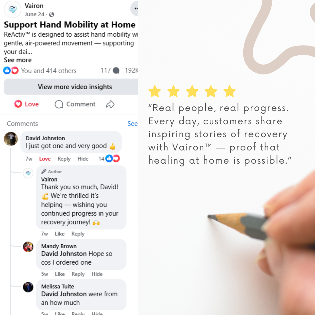 Vairon is designed to complement professional therapy, not replace it. It helps continue gentle hand movement between therapy sessions, supporting consistency when clinic visits aren’t possible every day.